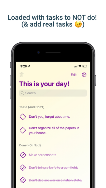 ToDont is een unieke productiviteitsapp voor iPhone die gebruikers aanmoedigt om taken te noteren die ze juist niet moeten doen. Dit zorgt voor een speelse benadering van to-do lijsten, waarbij gebruikers zich kunnen concentreren op het afvinken van leuke en spontane taken. Met coole check-off effecten, zoals taken in vuur zetten of laten stuiteren, biedt de app een verfrissende manier om de dagelijkse routine te doorbreken.